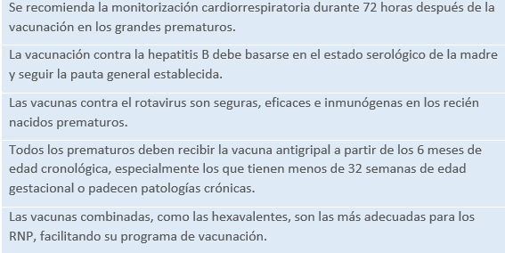 Los recién nacidos prematuros son especialmente susceptibles a infecciones debido a la inmadurez de su sistema inmunitario y otras condiciones asociadas a la prematuridad, como la menor transferencia de anticuerpos maternos y la menor tasa de lactancia materna. Aunque la respuesta inmunitaria a las vacunas puede ser menor en prematuros, se alcanzan concentraciones protectoras de anticuerpos con la vacunación completa. A pesar de ello, la vacunación de los prematuros puede experimentar retrasos debido a preocupaciones sobre su seguridad y a la presencia de patologías que contraindican temporalmente la vacunación. Se recomienda vacunar a los recién nacidos prematuros de acuerdo con su edad cronológica, siguiendo el mismo esquema que los nacidos a término, aunque a menudo se producen demoras en la vacunación en los primeros meses de vida. Dentro del calendario vacunal de estos niños, hay que prestar especial atención a la prevención de enfermedades graves como tosferina, hepatitis B, enfermedad invasiva por Haemophilus influenzae tipo B, meningococo y neumococo, rotavirus y gripe, así como al virus respiratorio sincitial (VRS).