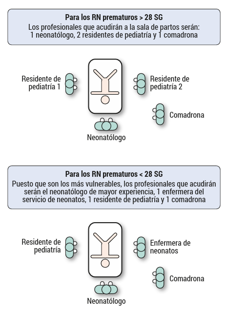 Es crucial delinear qué profesionales estarán involucrados en el nacimiento del recién nacido prematuro, así como en su reanimación, estabilización y traslado, y asignar claramente las funciones de cada uno. Esta organización garantiza una atención de calidad y coordinada. Se recomienda que haya un mínimo de tres personas para atender a cada recién nacido.