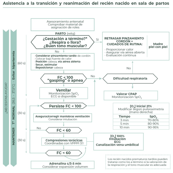 Basándonos en los documentos de consenso de la Sociedad Española de Neonatología (SENeo) de 2021 y de la International Liaison Committee on Resuscitation (ILCOR) de 2020 la actuación recomendada ante una situación crítica en la sala de partos se basará en los siguientes puntos:
