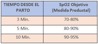 En cuanto a la concentración de oxígeno, en los RN a término iniciaremos la ventilación con aire ambiente, es decir con una FiO2 de 21% (FiO2 de 0.21) mientras que en menores de 32 semanas de gestación se empezará con una FiO2 entre el 21 y el 30% (FiO2 de 0.21 – 0.3) y se regulará a lo largo de la reanimación de forma progresiva para alcanzar una SpO2 preductal objetivo de acuerdo a la siguiente tabla:
