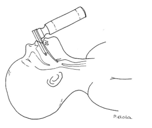 - Colocación de cánula orofaríngea (tipo Guedel): mientras que en los lactantes este tipo de cánulas se colocaba con la concavidad hacia abajo con la ayuda de un depresor lingual, en niños y adolescentes se colocará como en el adulto, con la concavidad hacia arriba hasta toparse con la parte posterior del paladar para girar posteriormente 180º hasta colocarla.