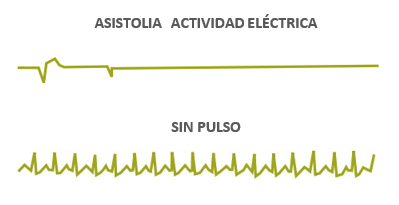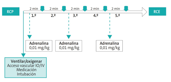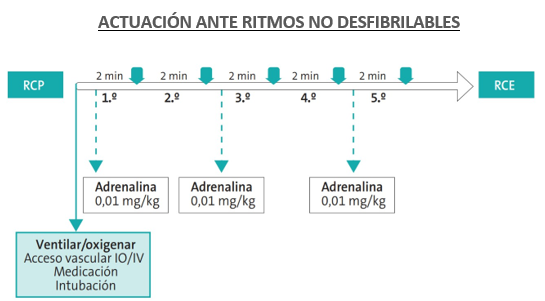 En caso de presencia de asistolia o TVSP (menos frecuentes en esta edad), seguiremos el mismo esquema de ritmos no desfibrilables empleado en la etapa previa: