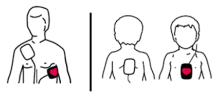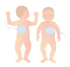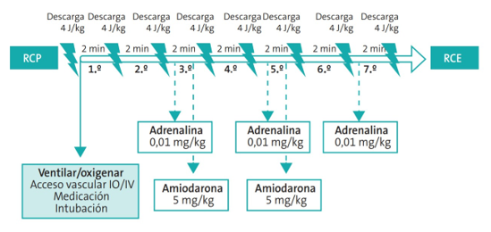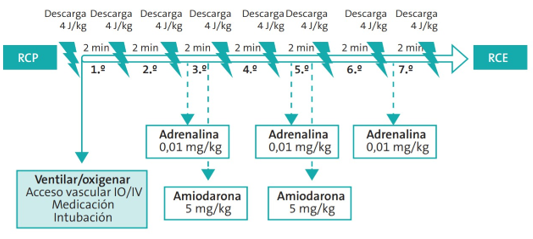 En caso de presencia de TVSP o FV, será necesaria la desfibrilación eléctrica precoz. Para ello, podremos colocar los parches o palas (de tamaño pequeño, es decir, de 4,5 cm de diámetro para menores de 1 año o de menos de 10 Kg de peso; y de tamaño grande [8-10 cm de diámetro] para niños mayores de 1 año o de más de 10 Kg de peso) en posición antero posterior o en posición esternal-apical, en función del tamaño del tórax del niño/adolescente. La descarga recomendada, será de 4 J/Kg siguiendo el siguiente esquema: