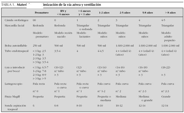 - Intubación endotraqueal: para la preparación del laringoscopio, elegiremos pala curva a partir del año, pudiendo utilizar hasta ese momento tanto palas curvas como rectas, adaptadas al tamaño del niño (en la tabla posterior, se muestra una orientación sobre el número de pala elegida en función de la edad del niño).
