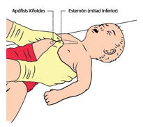 - Comprimir en el tercio inferior del esternón con técnica de los dos pulgares envolviendo el tórax con el resto de la mano como primera elección.