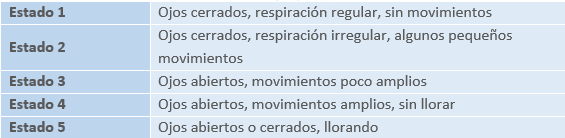 Según Prechtl se pueden diferenciar cinco estados de sueño-vigilia, siendo los estados más eficaces para valorar neurológicamente a un niño y tomar sus constantes vitales el tres y el cuatro: