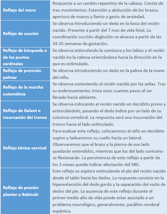 - Presencia de reflejos primarios: Consiste en un conjunto de reacciones involuntarias que se producen ante la aparición de estímulos y que favorecen la supervivencia del neonato durante la primera etapa de su desarrollo. Su presencia se justifica por la inmadurez del sistema nervioso central del recién nacido, que le impide realizar movimientos voluntarios y coordinados. Su ausencia es signo de depresión neurológica neonatal, ya que muchos están relacionados con funciones vitales como la alimentación.