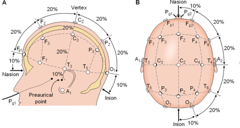Los electrodos se nombran según la región cerebral sobre la que están situados, con una numeración, de menor a mayor, desde las áreas anteriores a posteriores y con números impares para el hemisferio izquierdo y pares para el derecho.