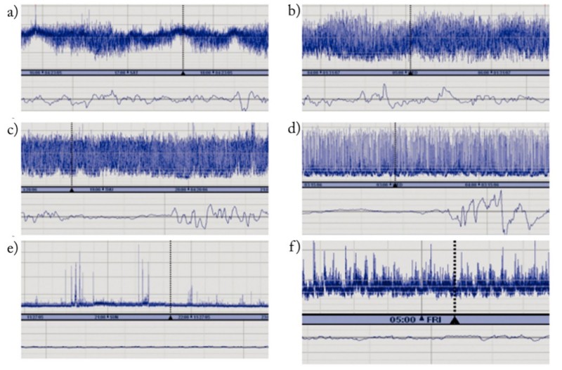 Imagen 11. Clasificación de trazados de base de electroencefalografía integrada de amplitud. a) Continuo con ciclos de vigilia-sueño maduros en niño a término. b) Continuo alternando con discontinuo con ciclos de vigilia-sueño inmaduros en niño prematuro. c) Discontinuo. d) Brote-supresión. e) Inactivo. f) Hipovoltado.. Bibliografía: Valverde E, García-Alix A, Blanco D. Monitorización continua de la función cerebral mediante electroencefalografía integrada de amplitud. An Pediatr Contin. 2008;6(3):169-173.
