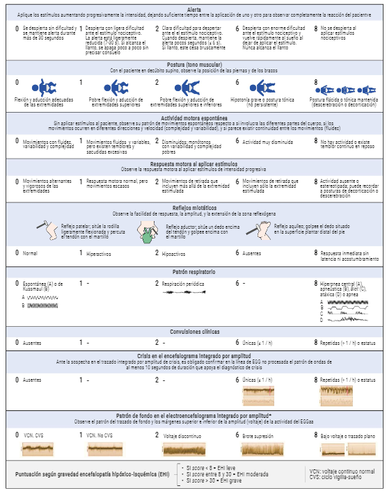 Es importante analizar la evolución de los patrones de aEEG durante las primeras 48 horas tras la lesión hipóxico-isquémica, ya que una mejoría de las características del trazado y la aparición de ciclos sueños-vigilia antes de las 36 horas de vida, mejoran el pronóstico del recién nacido.