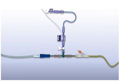 - Pinzar la salida de la orina hacia la bolsa colectora hasta conseguir que todo el catéter vesical y el sistema de medición estén llenos y sin burbujas.