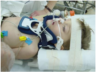 Ilustración 87. Inmovilización cervical de paciente politraumatizado pediátrico. Fuente: Luis Renter Valdovinos. Cómo inmovilizar y transportar al niño politraumático. Servicio de cuidados intensivos pediátricos y SEM Pediátrico. Hospital Universitario maternoinfantil Vall d´Hebron. Barcelona. 2009. https://scpediatria.cat/docs/ciap/2009/pdf/LRenter_ciap2009.pdf