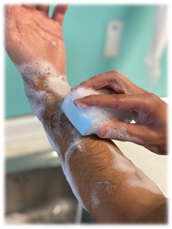 - Se aclaran manos y antebrazos siempre manteniendo las manos por encima de los codos y separadas del cuerpo. si el vello de antebrazos retiene espuma no se frota se repite el aclarado manteniendo la posición de los brazos las veces que sean necesarias.