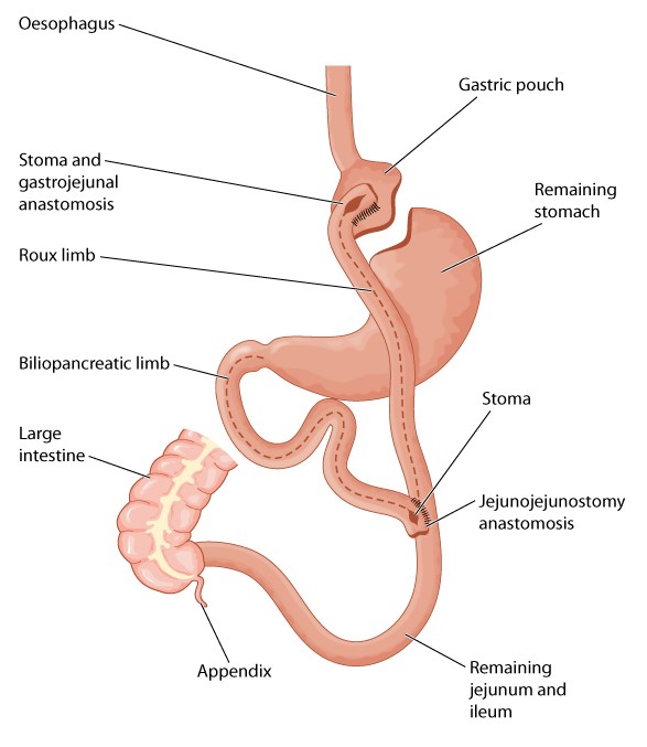 El bypass gástrico consiste en la creación de un reservorio gástrico (independiente dl resto del estómago) de entre 15-30 cc de capacidad, normalmente de forma tubular a lo largo de la curvatura menor del estómago, al que posteriormente se anastomosa el yeyuno. A una distancia variable entre 120-200 cm de la anastomosis (Y de Roux corta o larga), se realiza la anastomosis yeyuno-yeyunal (para el aporte de las secreciones bilio-pancreáticas). Puede realizarse de manera abierta o laparoscópica, describiremos la segunda puesto que es la más usada.