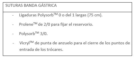 - Técnica quirúrgica: una vez dentro de la cavidad abdominal el cirujano retraerá el hígado, se introduce la banda en la cavidad y una vez localizado los cardias, se coloca la banda con la ayuda del pasabandas. El cirujano dará unos puntos de refuerzo a la banda y se dirigirá a suturar el reservorio a la fascia debajo de la entrada del trócar umbilical. Finalmente se comprobará el correcto funcionamiento de la banda, se cerrarán los accesos de los trócares y se infiltrara en ellos para evitar el dolor postoperatorio.