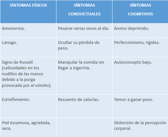 Las complicaciones físicas en la BN no provienen de desnutrición sino de las conductas de purga. Pueden aparecer los siguientes trastornos hidroelectrolíticos: hipopotasemia, hiponatremia, hipomagnesemia e hipocloremia, alcalosis metabólica (vómitos), acidosis metabólica (laxantes) e hiperamilasemia por aumento de isoenzima salivar. Y como trastornos digestivos puede presentar parotiditis, pérdida del esmalte dental y caries y esofagitis.