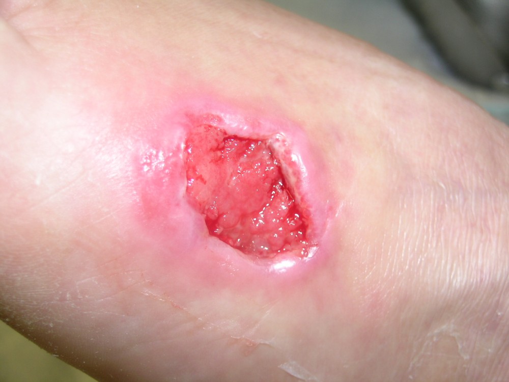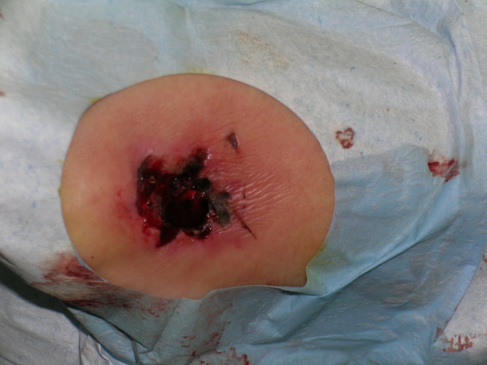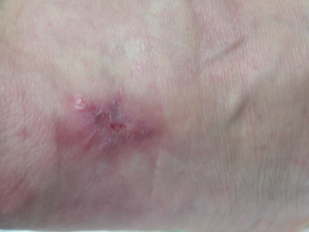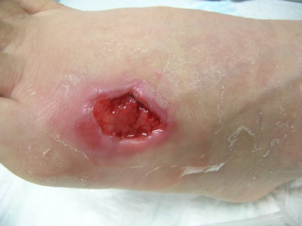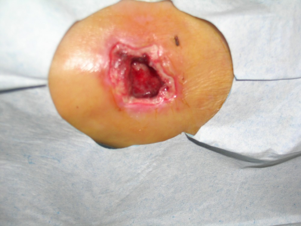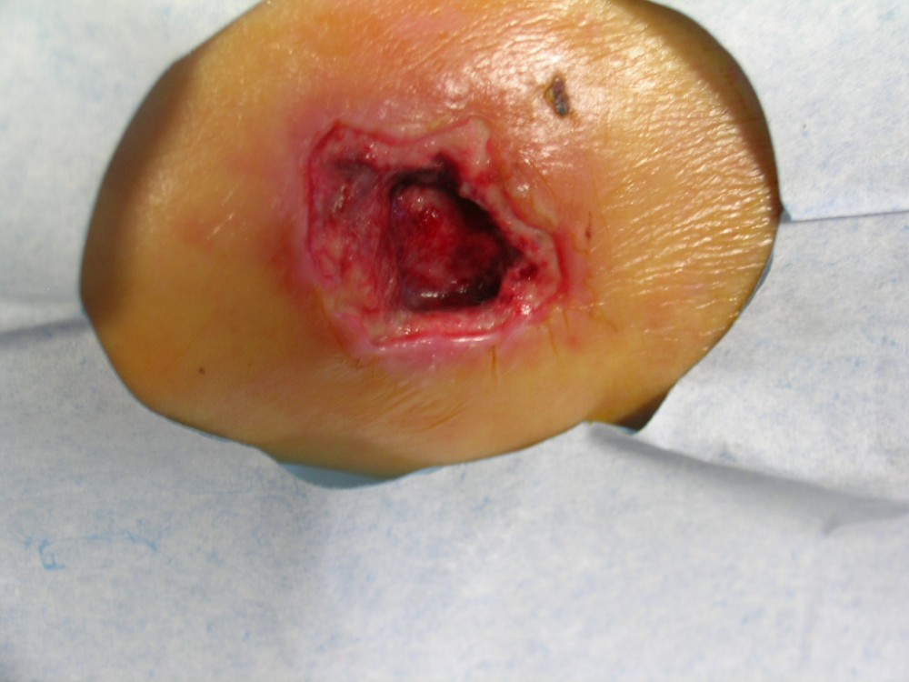 La paciente acudió el 12-8-2013 con una contusión fuerte en antepié izquierdo que fué tratada con inmovilización, analgesia y tratamiento anticoagulante con heparina de bajo peso molecular. y descarga de la extremidad. A la semana acude a revisión presentando dolor intenso y zona de necrosis en supercie de contusión. El mismo día de revisión (19-8-2013) se realiza consulta con cirujano que realiza desbridamiento quirúrgico bajo A/L quedando una herida con buen fondo de granulación de 5 cm. de diámetro x 2 cm. de profundidad. Se mantiene tratamiento anticoagulante, se refuerza tratamiento analgésico y se instaura tratamiento antibiótico. Se pautan 3 curas semanales. Se hace control semanal de todos indicadores retirando el tratamiento antibiótico a la 3ª semana, se suspende el tratamiento anticoagulante a la 4ª semana, se suspende el tratamiento analgésico a la 7ª semana. Produciéndose la curación de la herida a la 8ª semana. Queda pediente de revisión al año del accidente por posibles secuelas cicatriciales.