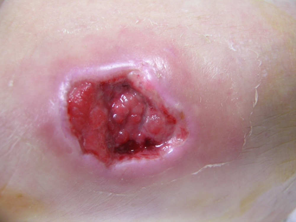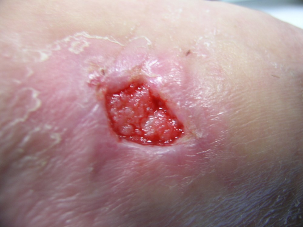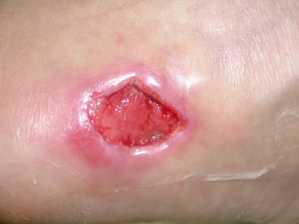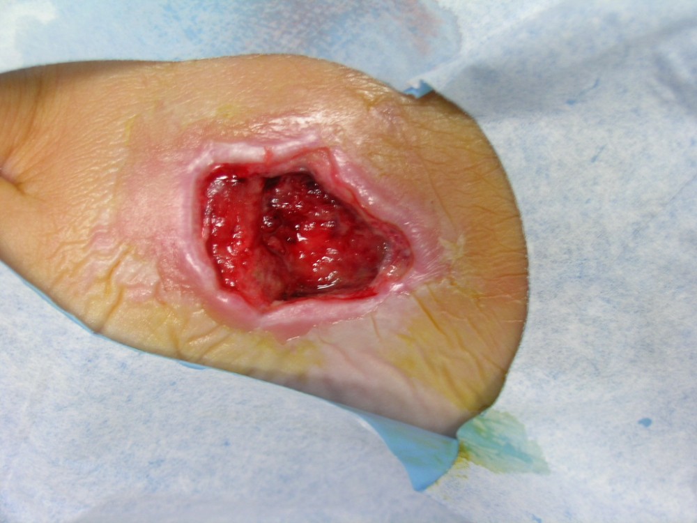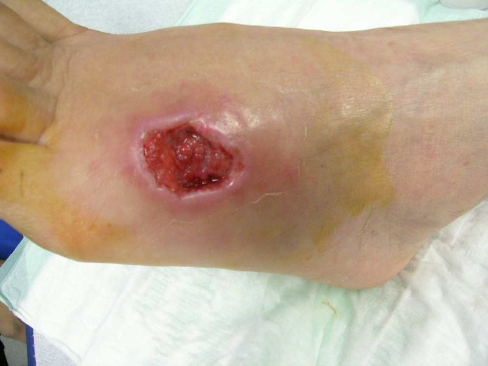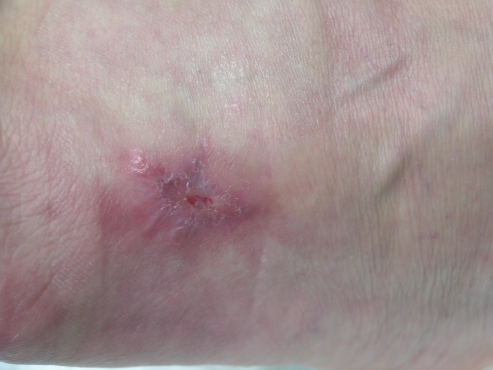 La paciente acudió el 12-8-2013 con una contusión fuerte en antepié izquierdo que fué tratada con inmovilización, analgesia y tratamiento anticoagulante con heparina de bajo peso molecular. y descarga de la extremidad. A la semana acude a revisión presentando dolor intenso y zona de necrosis en supercie de contusión. El mismo día de revisión (19-8-2013) se realiza consulta con cirujano que realiza desbridamiento quirúrgico bajo A/L quedando una herida con buen fondo de granulación de 5 cm. de diámetro x 2 cm. de profundidad. Se mantiene tratamiento anticoagulante, se refuerza tratamiento analgésico y se instaura tratamiento antibiótico. Se pautan 3 curas semanales. Se hace control semanal de todos indicadores retirando el tratamiento antibiótico a la 3ª semana, se suspende el tratamiento anticoagulante a la 4ª semana, se suspende el tratamiento analgésico a la 7ª semana. Produciéndose la curación de la herida a la 8ª semana. Queda pediente de revisión al año del accidente por posibles secuelas cicatriciales.