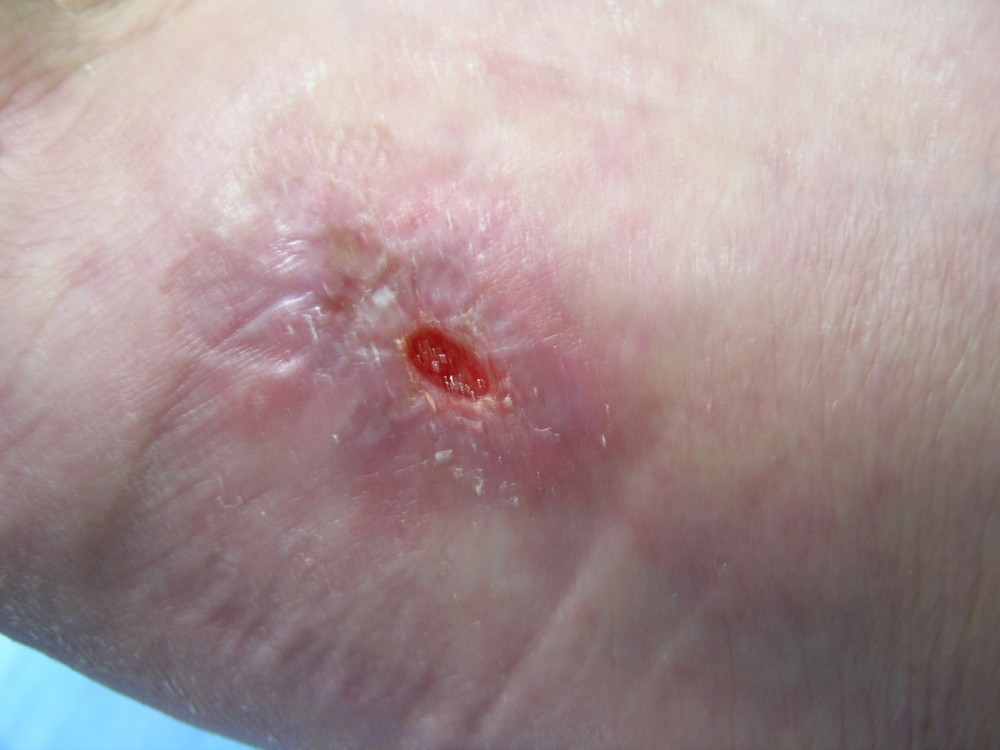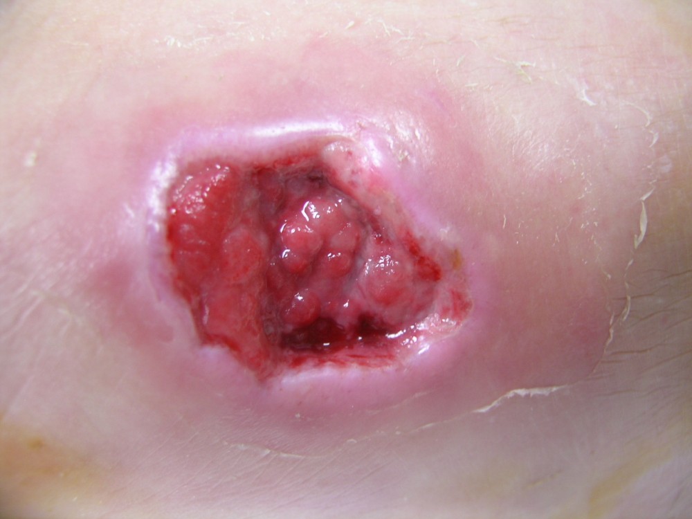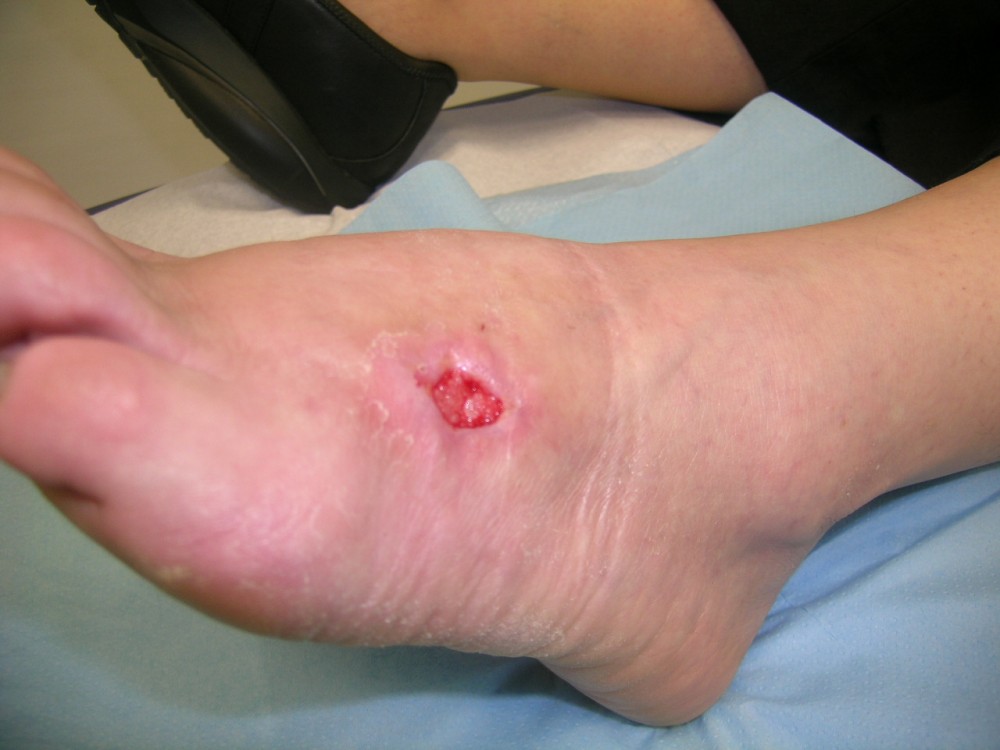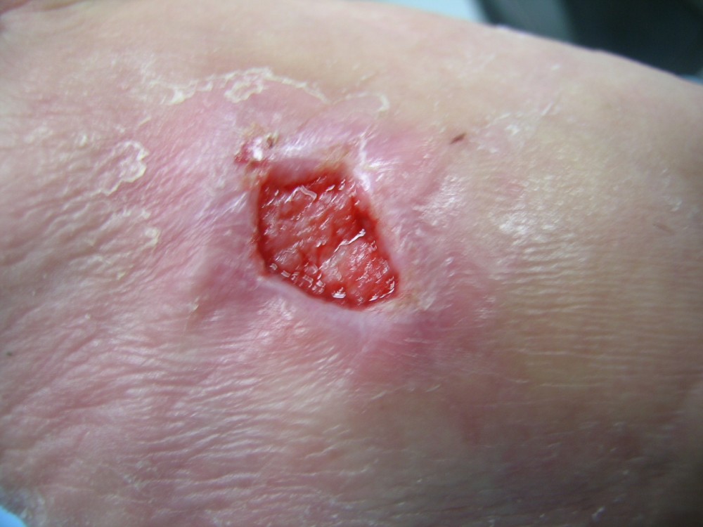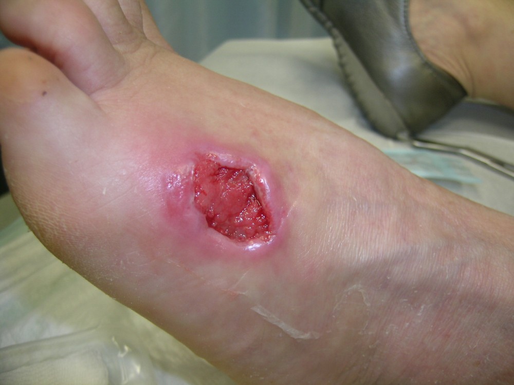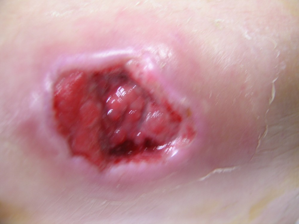 La paciente acudió el 12-8-2013 con una contusión fuerte en antepié izquierdo que fué tratada con inmovilización, analgesia y tratamiento anticoagulante con heparina de bajo peso molecular. y descarga de la extremidad. A la semana acude a revisión presentando dolor intenso y zona de necrosis en supercie de contusión. El mismo día de revisión (19-8-2013) se realiza consulta con cirujano que realiza desbridamiento quirúrgico bajo A/L quedando una herida con buen fondo de granulación de 5 cm. de diámetro x 2 cm. de profundidad. Se mantiene tratamiento anticoagulante, se refuerza tratamiento analgésico y se instaura tratamiento antibiótico. Se pautan 3 curas semanales. Se hace control semanal de todos indicadores retirando el tratamiento antibiótico a la 3ª semana, se suspende el tratamiento anticoagulante a la 4ª semana, se suspende el tratamiento analgésico a la 7ª semana. Produciéndose la curación de la herida a la 8ª semana. Queda pediente de revisión al año del accidente por posibles secuelas cicatriciales.