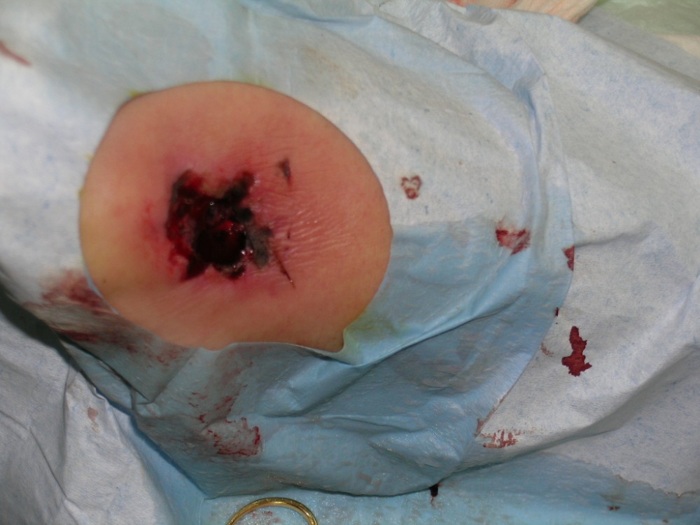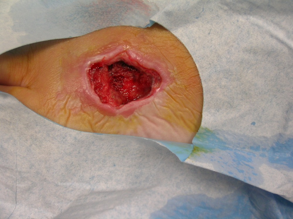Motivo de consulta: Paciente que acude el 12-8-2013 a nuestro centro asistencial con una fuerte contusión en pie izquierdo. Es trasladada por un compañero de trabajo. Tras ser vista y realizada exploración radiológica negativa. Se realiza vendaje compresivo y se le deja con carga relativa de EI Izda. con ayuda de bastones ingleses. Tto. analgésico y reposo. A la semana (19-8-2013) en la revisión refiere dolor intenso en antepié izquierdo desde hace 3 días. El vendaje aparece manchado. Al retirar vendaje aparece zona necrosada en cara externa del antepié izquierdo. Tras interconsulta con cirugía plástica se decide realizar desbridamiento bajo A/L. Antecedentes personales: -Alérgica a METAMIZOL y PENICILINA. - No refiere enfermedades. - Vacunada Difteria- Tétanos. - No fumadora. - No patología ginecológica. Ha tenido 1 parto a los 26 años (sin complicaciones)