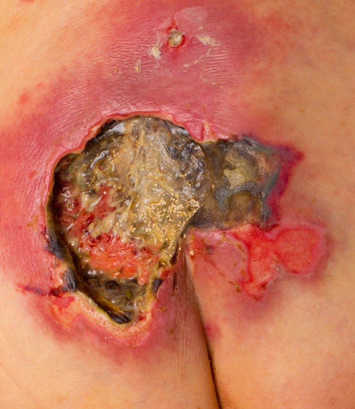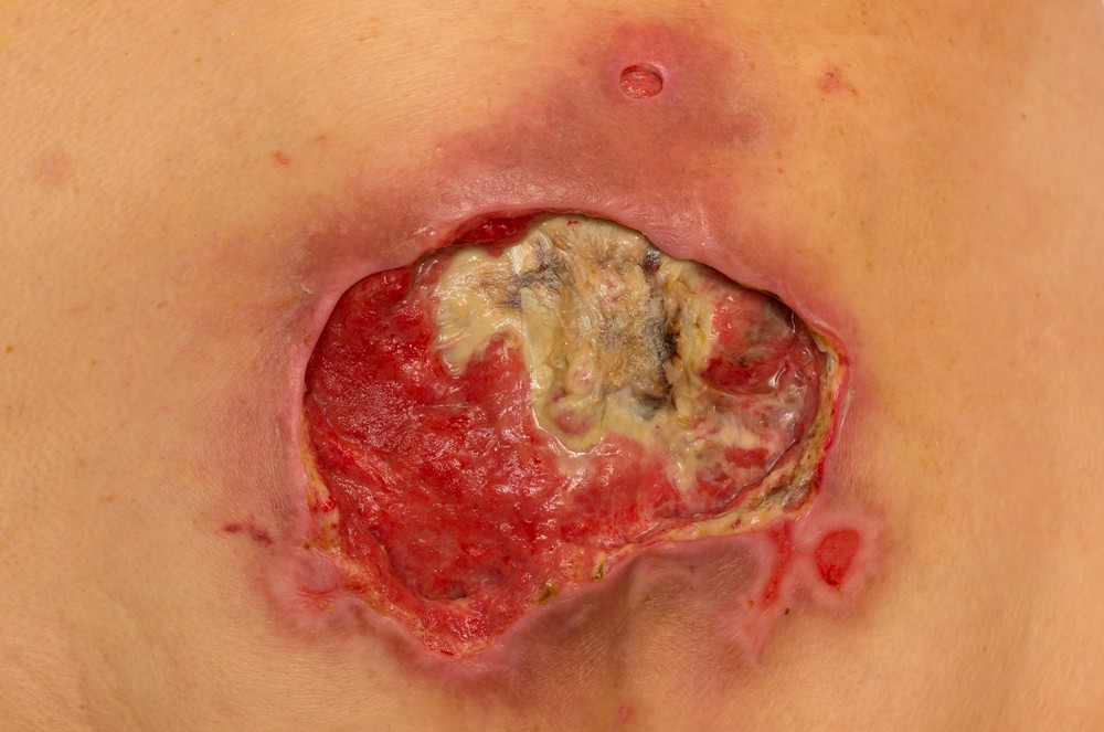 Motivo de consulta: La paciente fue diagnosticada hace 10 años de la Enfermedad de Alzheimer. Un familiar avisa al centro de salud indicando que tiene una herida en el sacro que ha empeorado rápidamente. Antecedentes personales: - No alergias conocidas - Enfermedad de Alzheimer diagnosticada hace 10 años. - Ex-fumadora desde hace 10 años (20 cigarros/día).